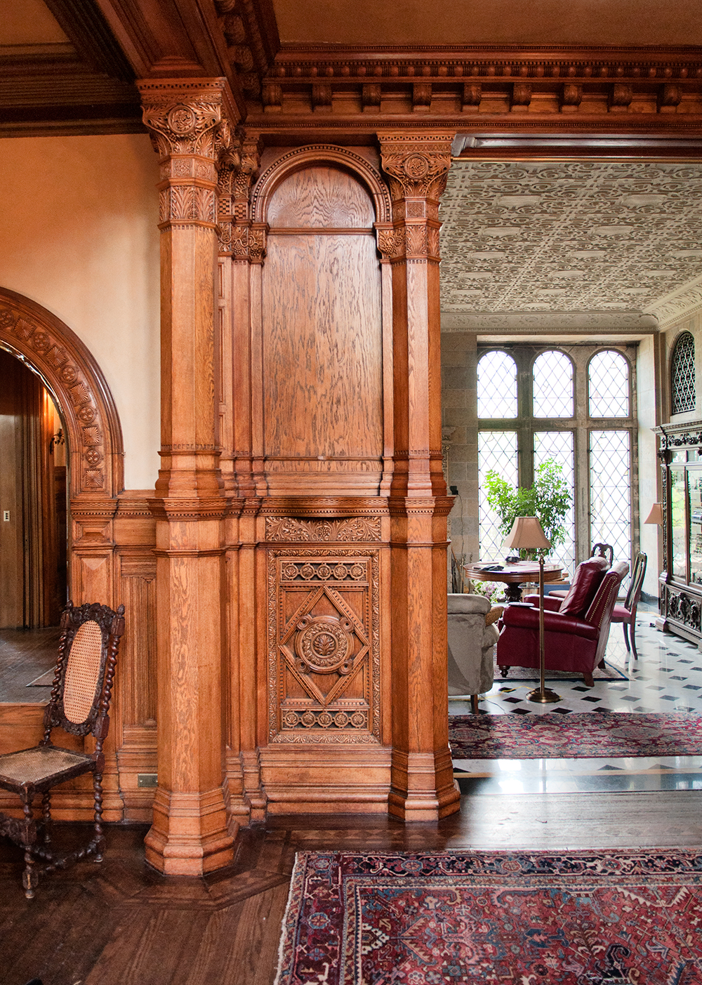 Standing in the foyer, looking at the grand staircase designed by Clarence Johnson. The music room is in the background. Photo: Alice Gebura